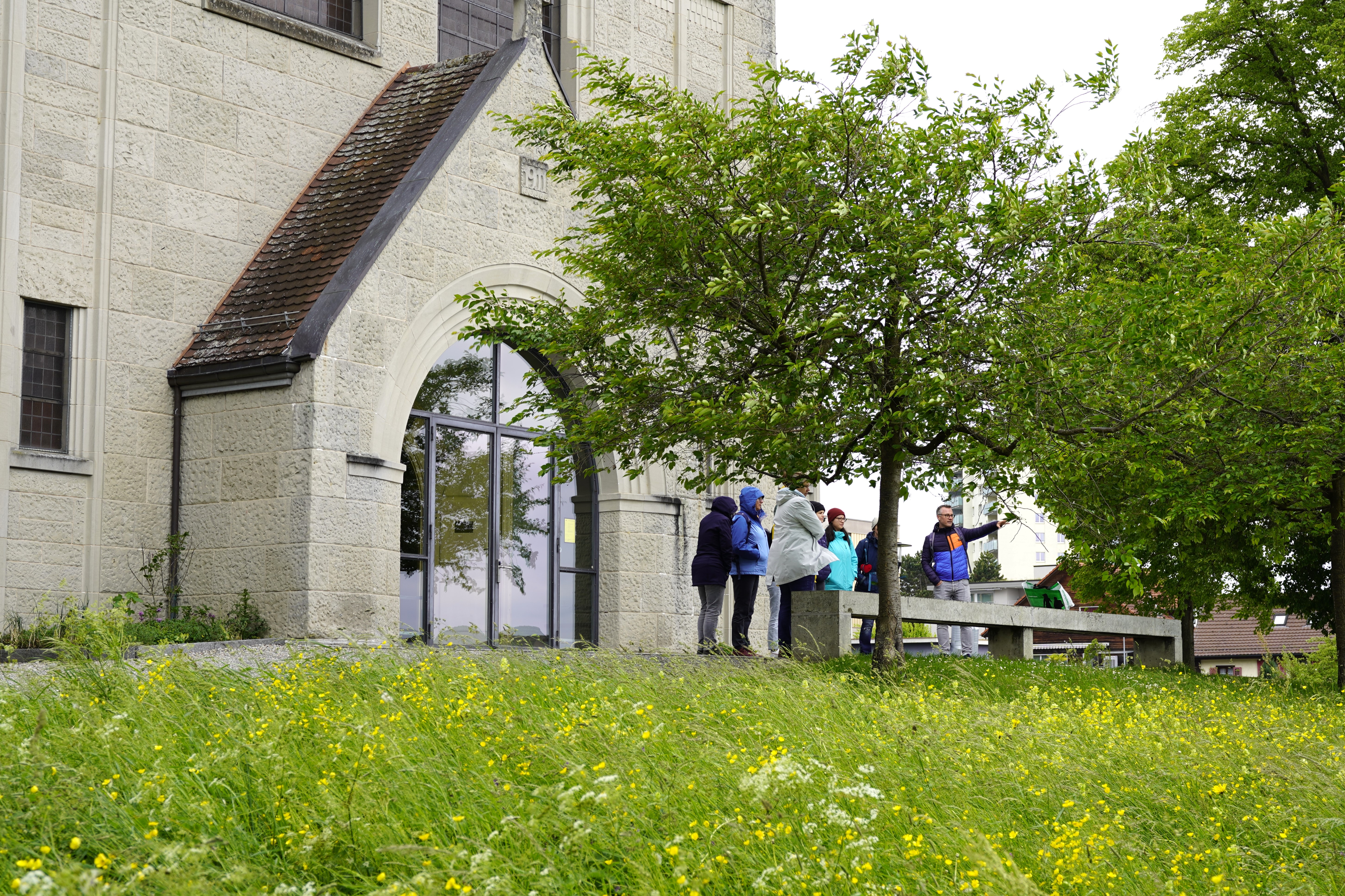 Bei der angrenzenden Kirche blühte die Blumenwiese in voller Pracht. Ein Blick nach oben zeigt den Kirchenturm, in diesem nistete ein Turmfalkenpaar. Über einen Livestream (www.bodensee-falken.ch) können diese beim Brüten beobachtet werden. Ziel des Livestream ist es, die Bevölkerung zu sensiblisieren.