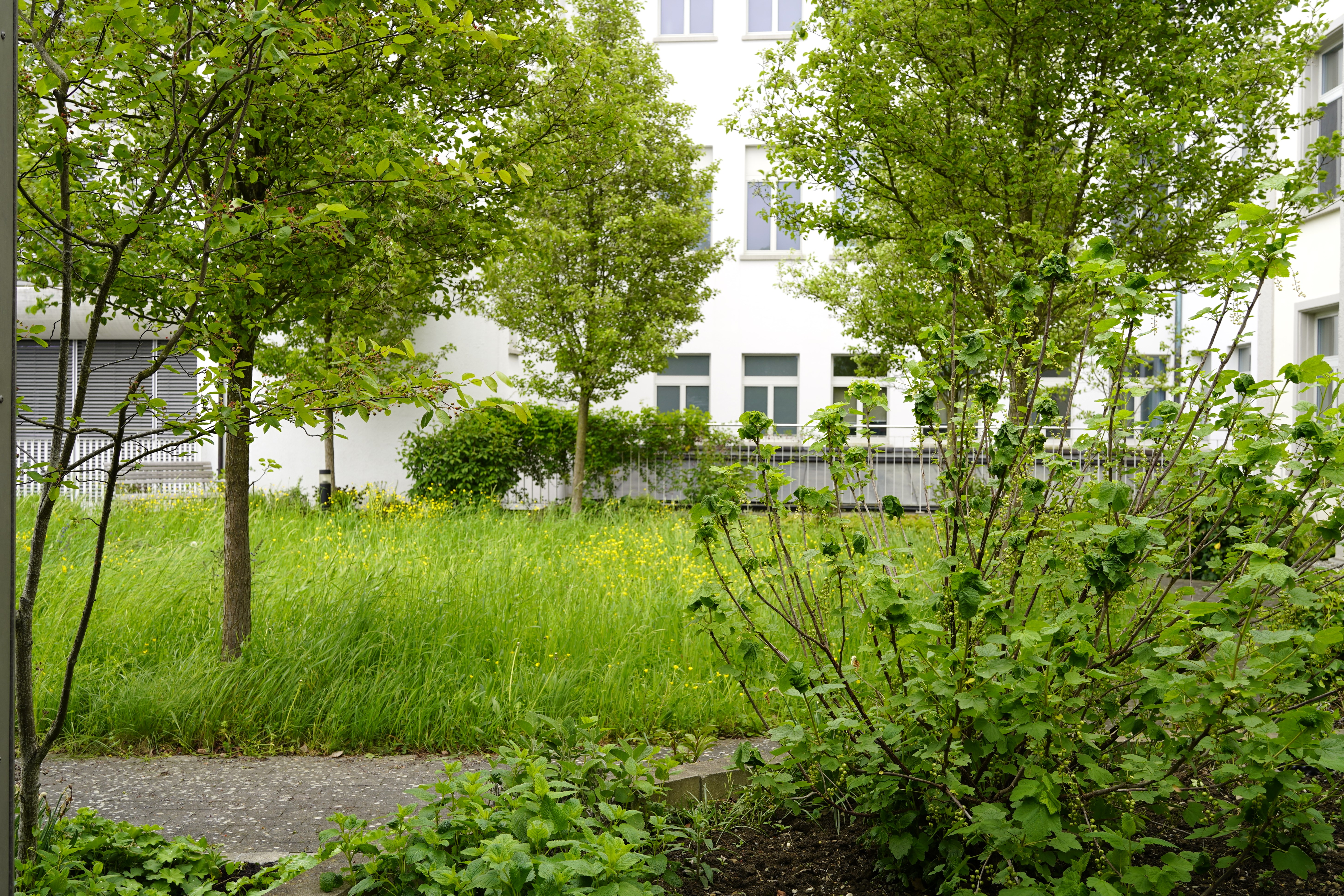 Beim Pestalozzischulhaus darf es wild sein und genau das macht diesen kleinen Schulpark so besonders. Biodiversität wird hier nicht nur gefördert, sondern direkt erlebbar gemacht. Verschiedene kleine Lebensräume sind miteinander vernetzt, etwa ein schmaler Graben, der sich bei Regen mit Wasser füllt und zum temporären Biotop wird. Alles ist so angelegt, dass es für die Schülerinnen und Schüler gut zugänglich ist - zum Entdecken, Beobachten und Staunen.